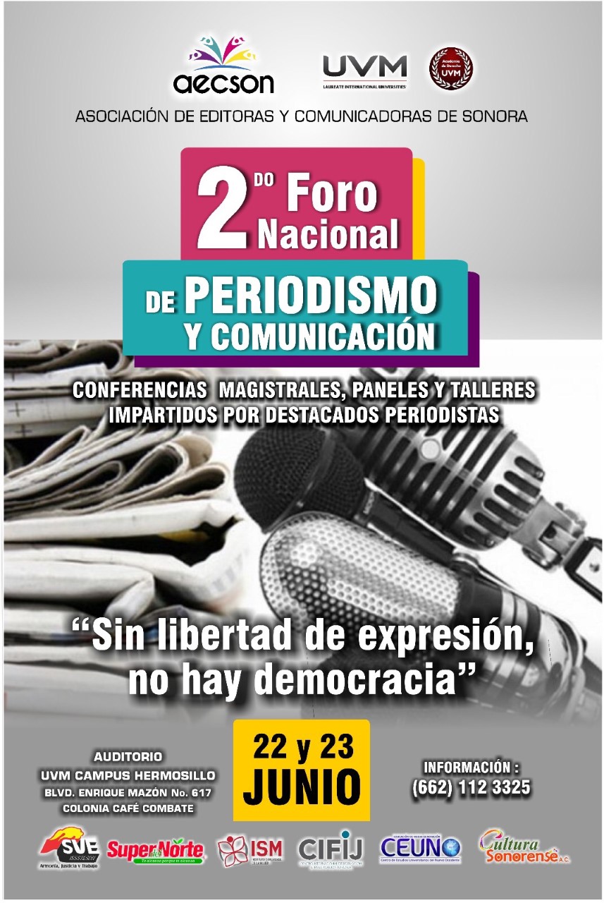 HERMOSILLO, SONORA, A 21 DE JUNIO DEL 2017.- Con el propósito de analizar los retos actuales que enfrentan los periodistas y comunicadores en México, así como construir una propuesta de protección para el gremio, la Asociación de Editoras y Comunicadoras de Sonora (AECSon) organiza el 2do. Foro Nacional de Periodismo “Sin Libertad de Expresión, no hay Democracia”.
