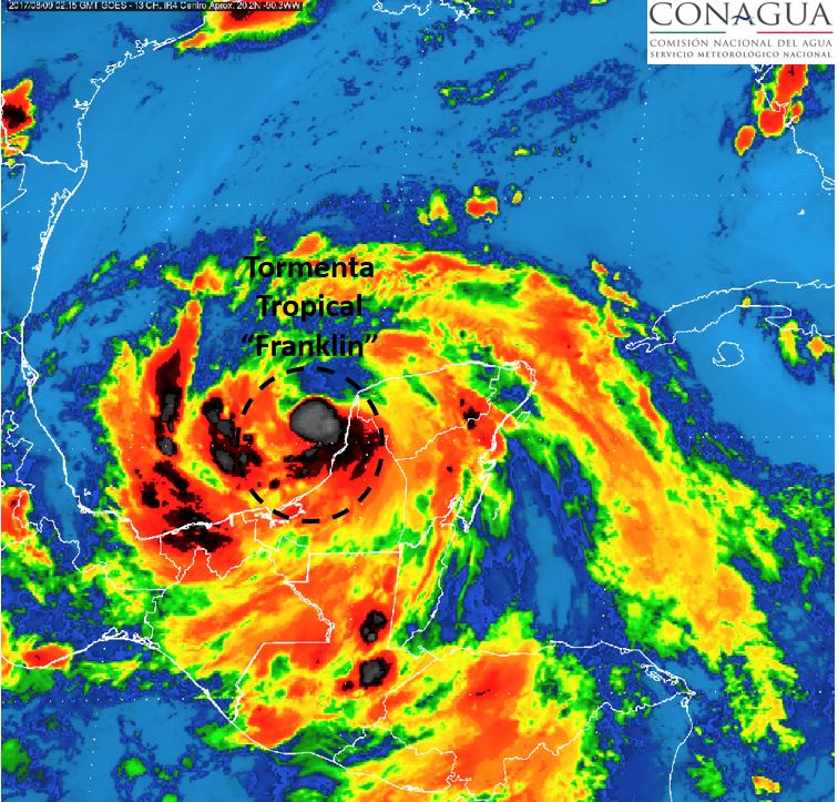 La Comisión Nacional del Agua informó que a las 19:00 horas de este martes 8 de agosto, la tormenta tropical ingresó a la cuenca marítima y se fortaleció sobre la Sonda de Campeche, a 400 km al noreste de Coatzacoalcos, Veracruz. Se esperan tormentas torrenciales, actividad eléctrica y viento fuerte en Veracruz, Tabasco y Campeche.