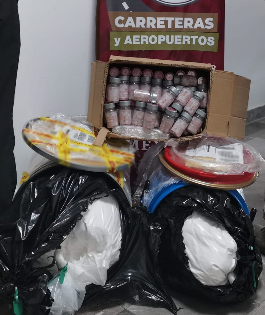 Como parte de las tareas de seguridad y vigilancia que realizan elementos de la Guardia Nacional y personal del Ejército Mexicano en el Aeropuerto Internacional de La Paz, Baja California, en una empresa de paquetería aseguraron aproximadamente 55 kilos 800 gramos presumiblemente de precursor químico y alrededor de 4 mil 500 cápsulas de medicamento controlado.