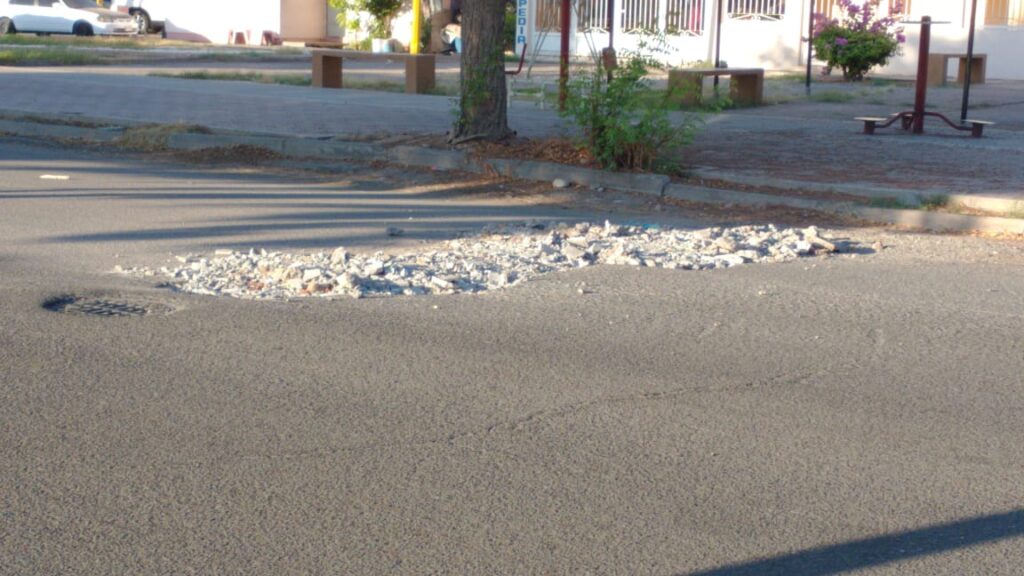 Ya que desde hace meses en este lugar se abrio el pavimento dejando una sanja por la calle Otancahui casi esquina con Jesús García, lugar en donde personal de bacheo o pavimentación “brilla por su ausencia”.
