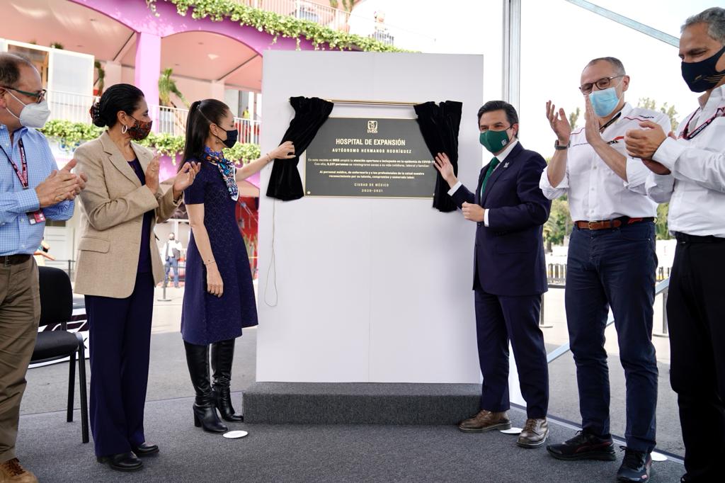 En el Autódromo Hermanos Rodríguez, el director general del Instituto Mexicano del Seguro Social (IMSS), Zoé Robledo, participó junto con la Jefa de Gobierno de la Ciudad de México, Claudia Sheinbaum; Stefano Domenicali, CEO de Grupo Formula 1; y Luis Alejandro Soberón Kuri, Presidente Ejecutivo y Director General de CIE, en la develación de la placa de reconocimiento al personal de salud del Instituto que hizo posible la recuperación de 8 mil 237 personas enfermas de COVID-19, atendidas en el Centro de Atención Temporal que se instaló en el Autódromo. Este hospital temporal fue el emblema del IMSS en la lucha contra la pandemia y se convirtió en una fortaleza médica en la etapa más crítica en la Ciudad de México.