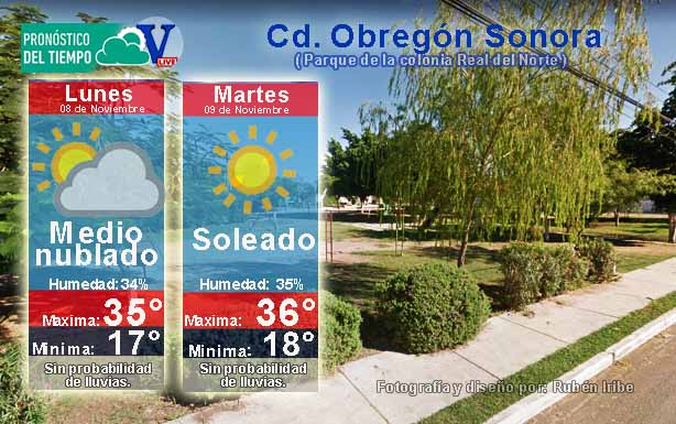 Para el martes 09 de noviembre se espera un día soleado con temperaturas mínimas de 18° grados centigrados y máximas de 36° teniendo 35% de humedad y sin probabilidad de lluvias.