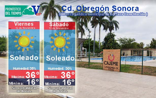 Este fin de semana en Cd. Obregón se espera una temperatura máxima de 36° grados centigrados, teniendo una mínima de 16° al amanecer (6:30 am) la humedad es poca con 35%, cielos completamente despejados y no se pronostican lluvias .