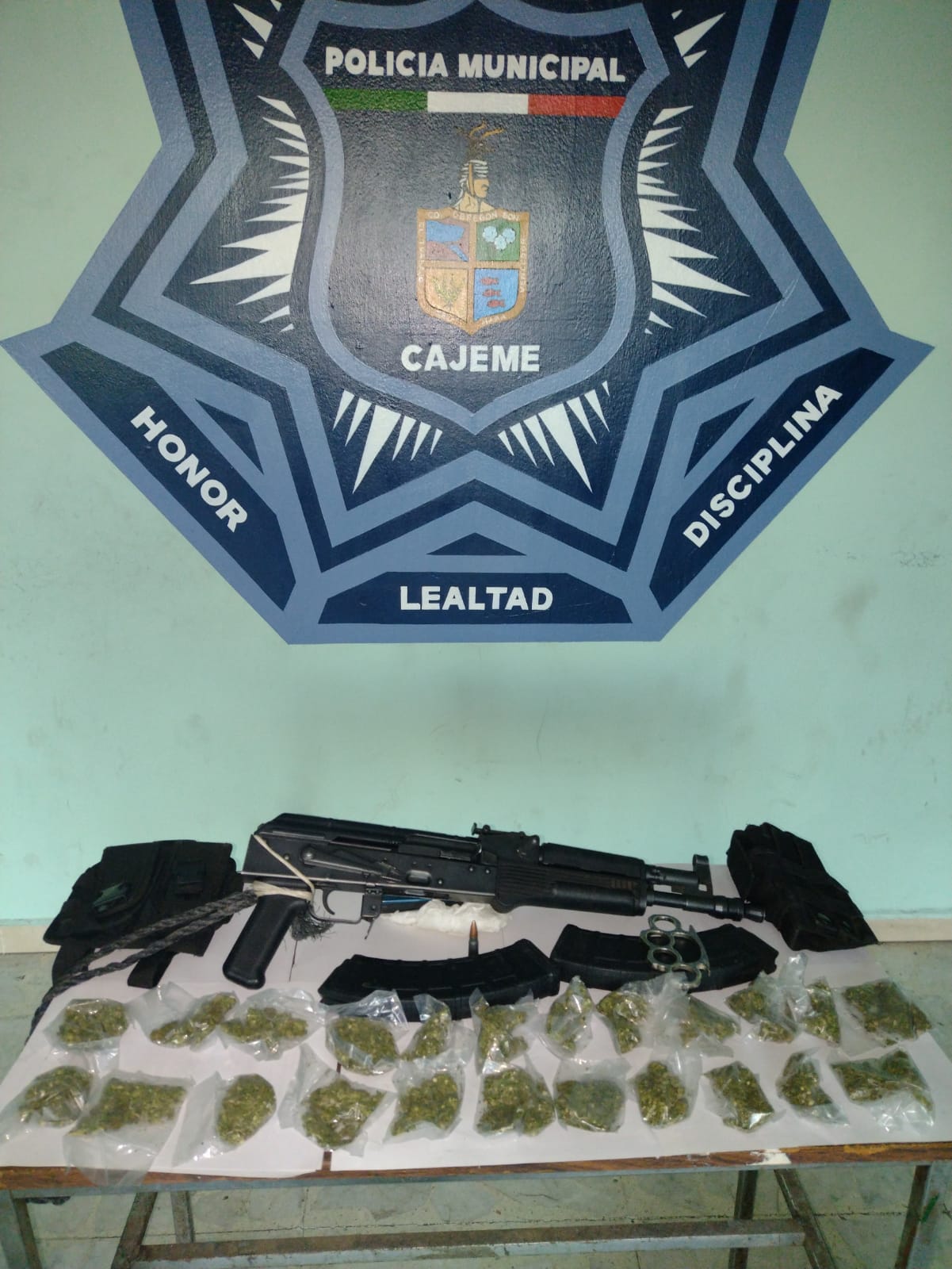 Al realizarles una inspección física los agentes les decomisaron un arma de fuego larga, dos cargadores abastecidos, diversos porta cargadores y 22 envoltorios de una hierva de color verde y seca con características similares a las de la marihuana.