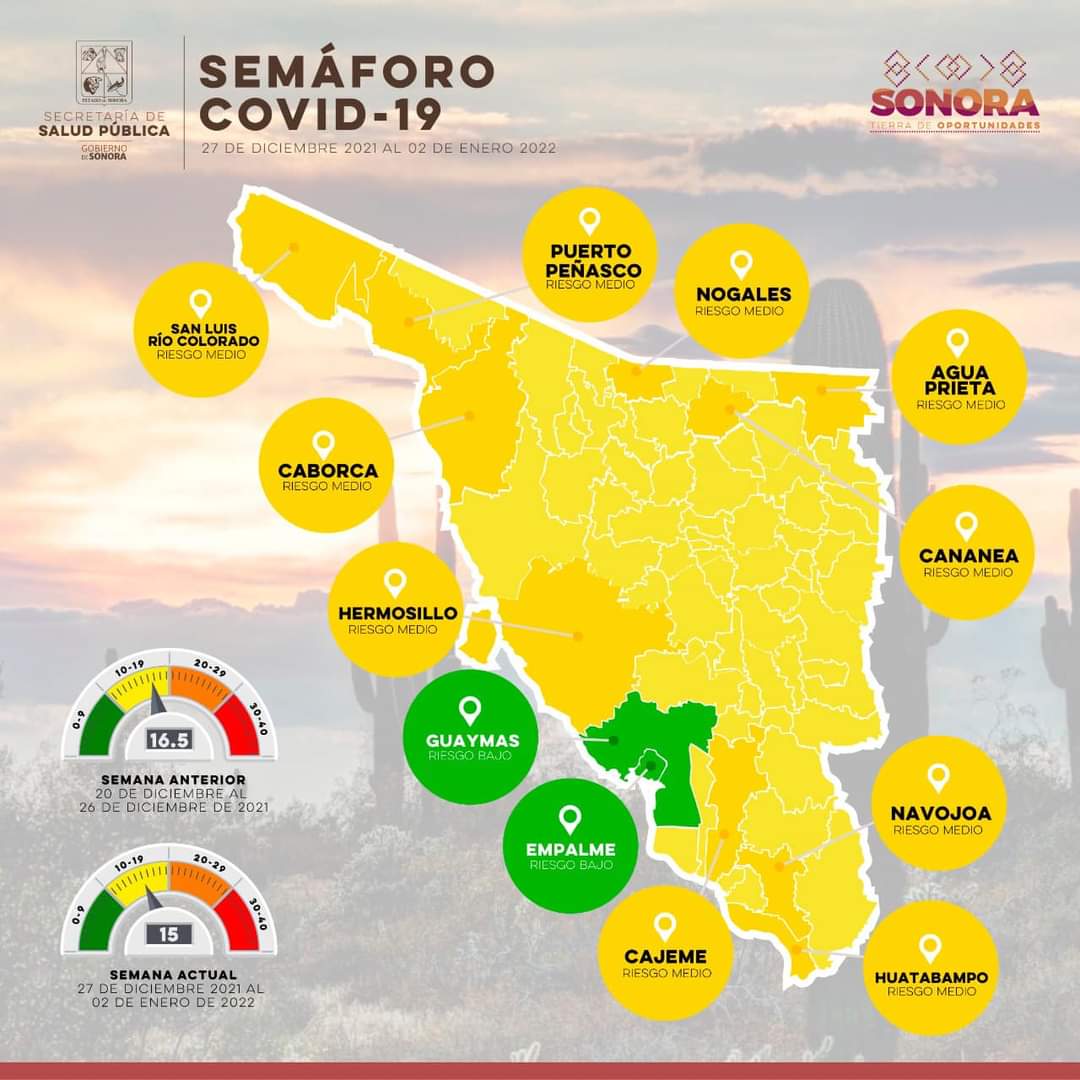 Debido a la baja de contagios y hospitalizaciones en Guaymas y Empalme, esta semana avanzaron al color verde en el semáforo, el cual se renueva cada semana.