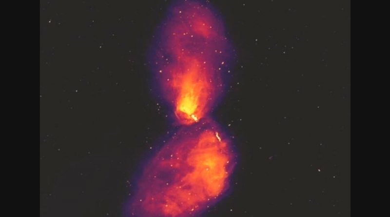 “Estas ondas de radio provienen del material que es absorbido por el agujero negro supermasivo en el medio de la galaxia. Forma un disco alrededor de éste, y a medida que la materia se desgarra acercándose a él, se forman poderosos chorros a ambos lados del disco, expulsando la mayor parte del material hacia el espacio, a distancias de probablemente más de un millón de años luz.
