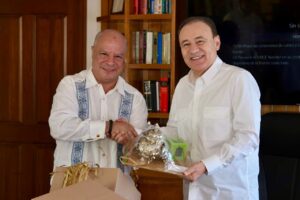 El gobernador Alfonso Durazo Montaño atendió una reunión de trabajo con Abdelfattah Lebbar, embajador de Marruecos en México, en seguimiento a la visita del cuerpo diplomático acreditado en México que se realizó en 2023 en Puerto Peñasco, donde se abordó la acciones que se llevan en el Plan Sonora.
