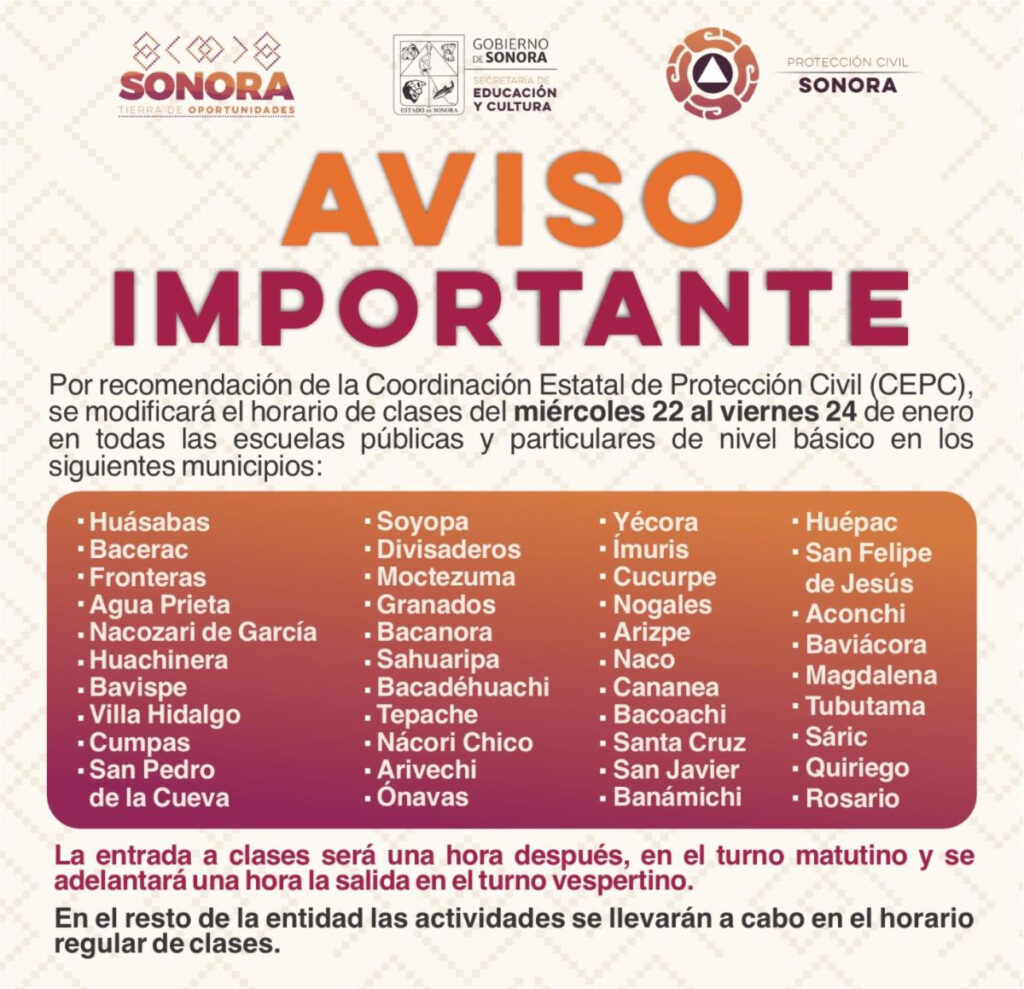Especificó que los municipios donde se aplicará dicha medida preventiva para proteger la salud de la comunidad escolar son: Huásabas, Bacerac, Fronteras, Agua Prieta, Nacozari de García, Huachinera, Bavispe, Villa Hidalgo, Cumpas, San Pedro de la Cueva, Soyopa, Divisaderos, Moctezuma y Granados.