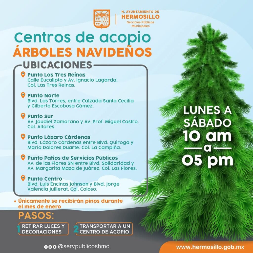 Para dar facilidades a la ciudadanía de Hermosillo, en el manejo de los pinos navideños naturales, Servicios Públicos Municipales seguirá recibiendo estos pinos en seis centros de acopio ubicados en varios sectores de la ciudad.