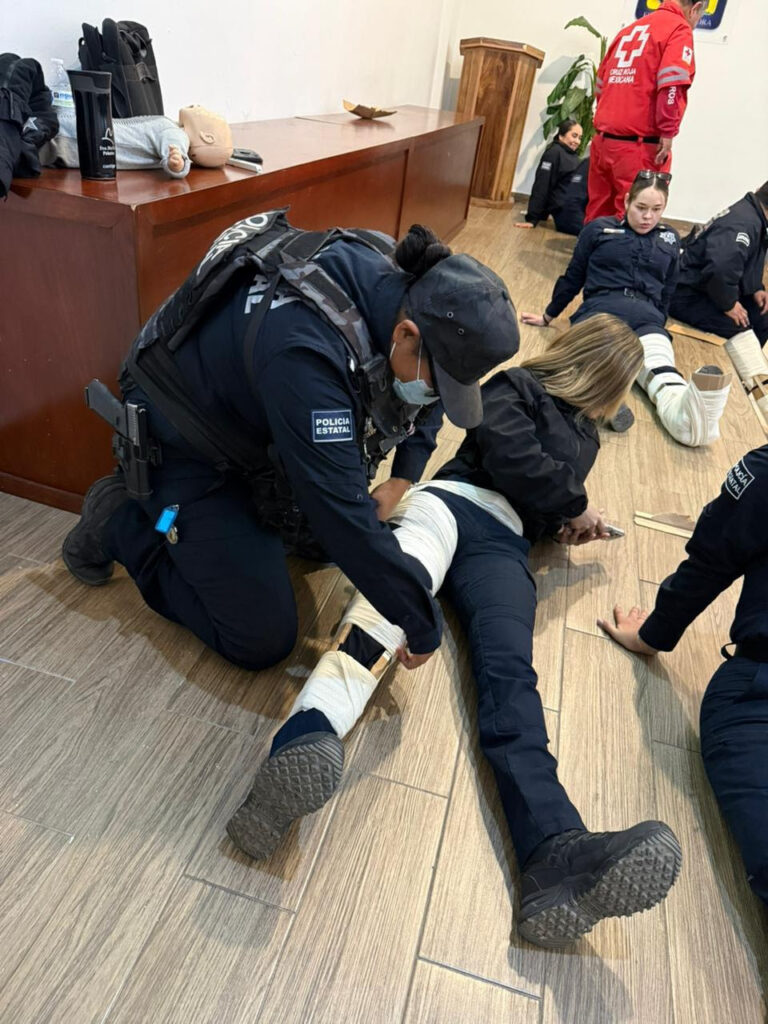 Para fortalecer la profesionalización de las fuerzas operativas de la Secretaría de Seguridad Pública (SSP), se realiza una capacitación para grupos de la Policía Estatal de Seguridad Pública (PESP) sobre un curso de “Primer Respondiente en Primeros Auxilios”.