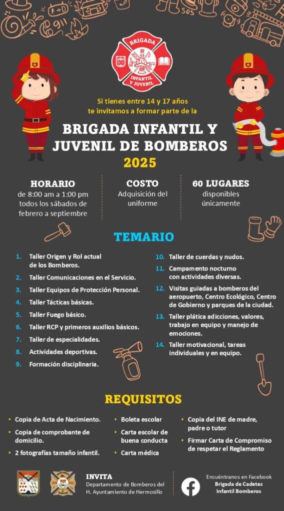 El Departamento de Bomberos de Hermosillo invita a adolescentes de entre 14 y 17 años a formar parte de la Brigada Infantil y Juvenil 2025, diseñada para brindar conocimientos y habilidades esenciales en materia de protección civil, primeros auxilios y disciplina.