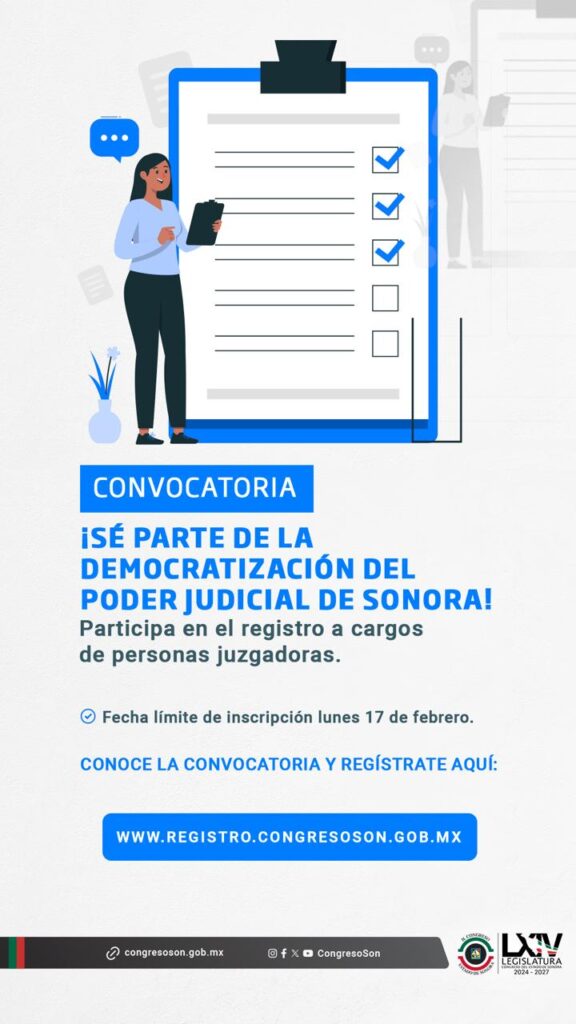René Luna Sugich, presidente del comité, informó que, para postularse, las personas interesadas deben registrarse en la página registro.congresoson.gob.mx y cumplir con los siguientes requisitos: licenciatura en Derecho; promedio académico mínimo ocho puntos en licenciatura, especialidad, maestría o doctorado, así como un promedio mínimo de nueve puntos en las materias relacionadas con el cargo al que aspiran; experiencia mínima de tres años, entre otros.