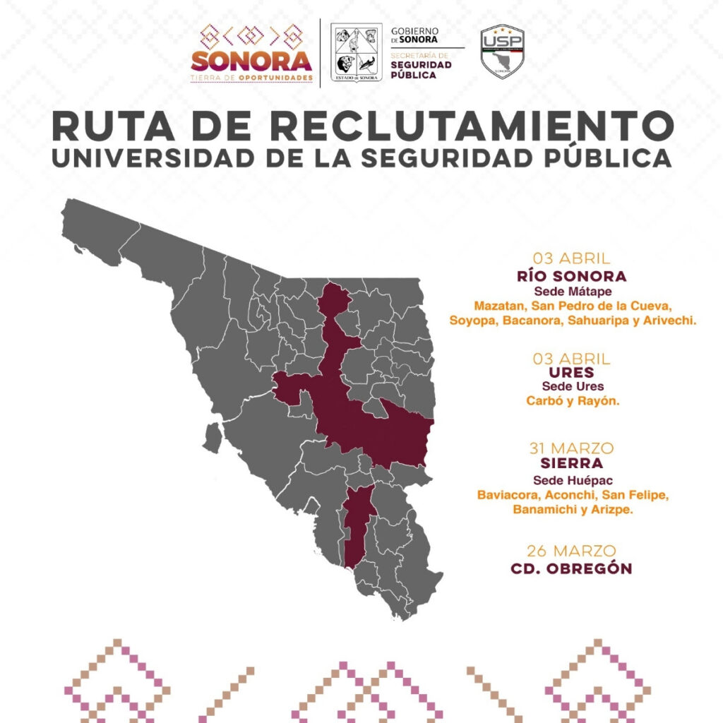 Del 26 de marzo al 3 de abril, personal de la Universidad de la Seguridad Pública (USP) recorrerá Cajeme, Mátape, Ures y Huépac para convocar a jóvenes interesados en formarse como policías de proximidad anunció, la Secretaría de Seguridad Pública (SSP) en Sonora.