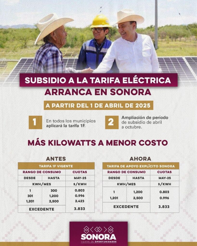 La tarifa 1F se aplicará en todos los municipios de la entidad desde el 1 de abril hasta el 31 de octubre, con lo que se prolonga el subsidio de verano por un mes adicional. Además, se han incrementado los rangos de consumo subsidiado, favoreciendo a miles de familias sonorenses.