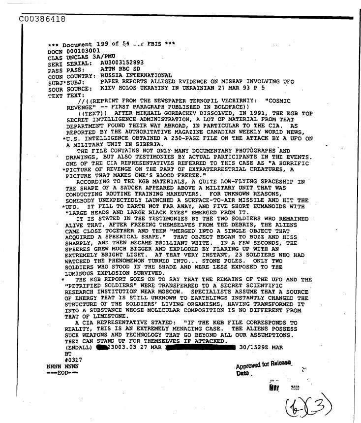 De acuerdo con el informe, una unidad militar soviética realizaba maniobras cuando detectaron un objeto volador no identificado sobrevolando a baja altitud. Los soldados supuestamente lograron derribar la nave, de la cual emergieron cinco seres humanoides. Estos seres se habrían fusionado en una sola figura, que emitió un destello de luz cegador que transformó a casi todos los presentes en “columnas de piedra”. Solo dos soldados sobrevivieron al estar protegidos tras una cobertura.