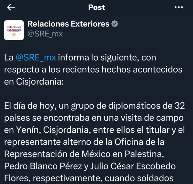 Ciudad de México, 21 de mayo de 2025 — La Secretaría de Relaciones Exteriores (SRE) informó que dos diplomáticos mexicanos fueron amedrentados con disparos por parte del ejército israelí durante una visita oficial a Yenín, en Cisjordania, junto a representantes de otros 31 países.