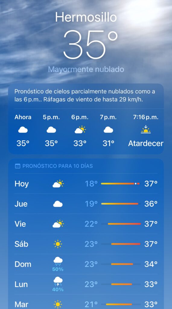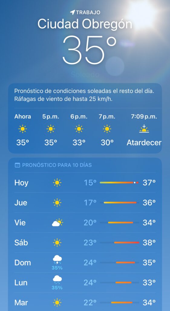 Según los reportes meteorológicos actualizados, Hermosillo tiene un 50% de probabilidad de lluvia el domingo y 40% el lunes, mientras que en Ciudad Obregón se pronostican lluvias con un 35% de probabilidad ambos días. Aunque se trata de porcentajes moderados, el simple hecho de ver lluvia en el pronóstico representa alivio y esperanza para miles de familias, productores y comunidades.