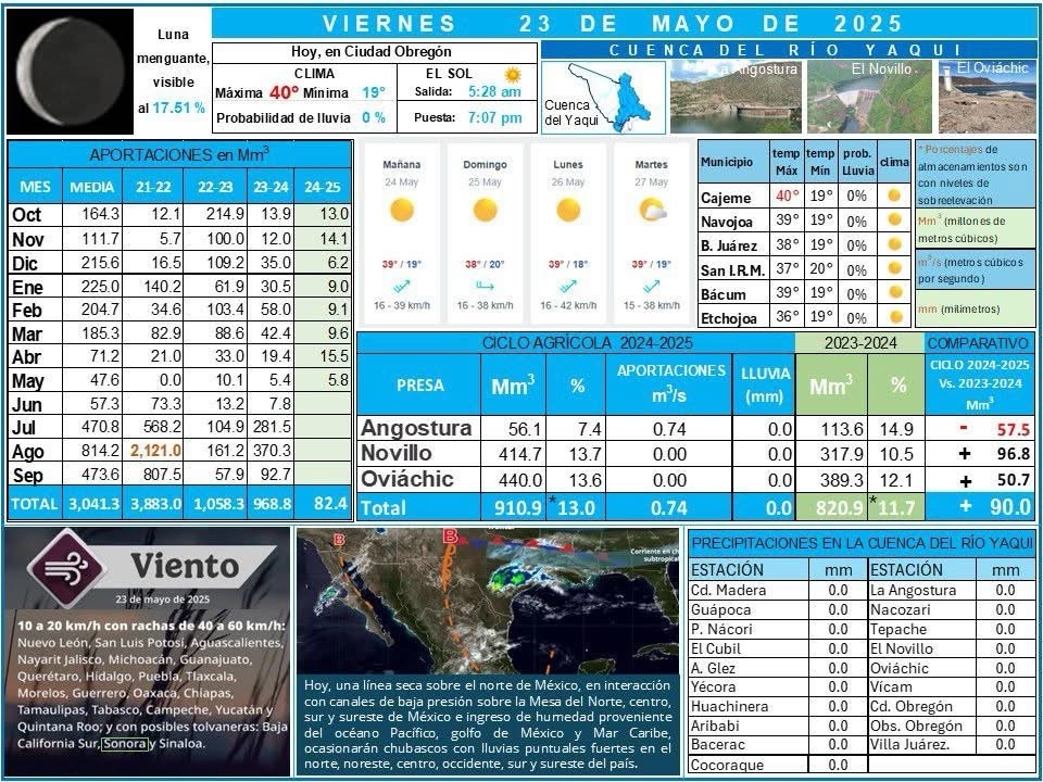 El boletín hidrometeorológico del 23 de mayo muestra con claridad la situación crítica de la Cuenca del Río Yaqui. Las tres principales presas se encuentran en niveles sumamente bajos:
