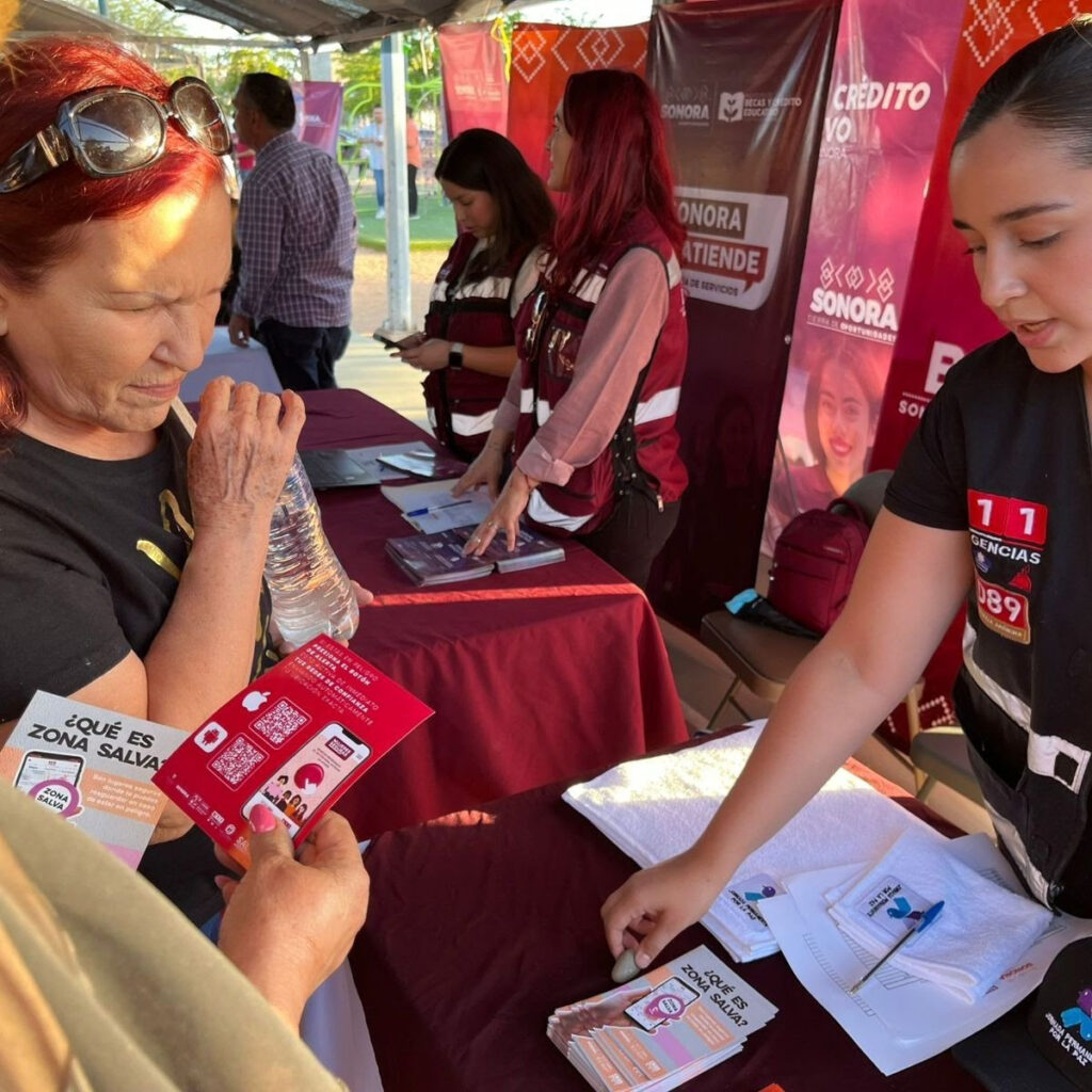 Durante la feria de servicios Sonora Atiende, se llevan hasta las colonias de la ciudad capital trámites y apoyos totalmente gratuitos de las distintas dependencias del Gobierno del Estado. La Secretaría de Seguridad Pública, por su parte, distribuye material para identificar violencias, promueve el uso responsable de la línea de emergencia, fomenta la denuncia anónima al 089, expone la estrategia de la Jornada Permanente por la Paz y alienta la descarga de las aplicaciones preventivas Mujeres Seguras y Antiextorsión Sonora.