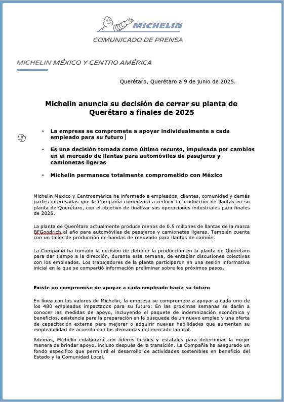 Querétaro, Qro., 9 de junio de 2025.– La empresa Michelin México y Centroamérica ha anunciado oficialmente su decisión de cerrar su planta ubicada en Querétaro para finales de este mismo año, como parte de un proceso de reducción de su producción de llantas. La decisión, según informó la empresa en un comunicado, responde a cambios significativos en el mercado de llantas para automóviles de pasajeros y camionetas ligeras.