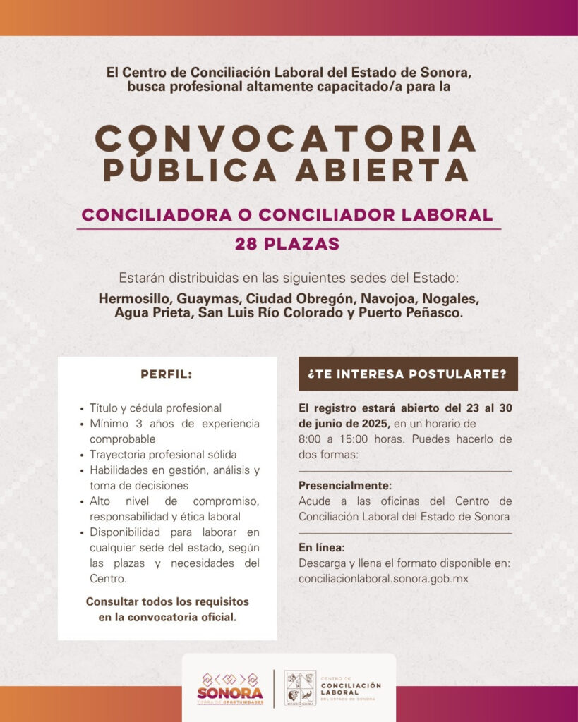 En cumplimiento del compromiso del gobernador Alfonso Durazo con el fortalecimiento del sistema laboral en la entidad, el Gobierno de Sonora, a través del Centro de Conciliación Laboral del Estado de Sonora (CCL Sonora), publicó la convocatoria para el proceso de selección de 28 personas conciliadoras laborales.