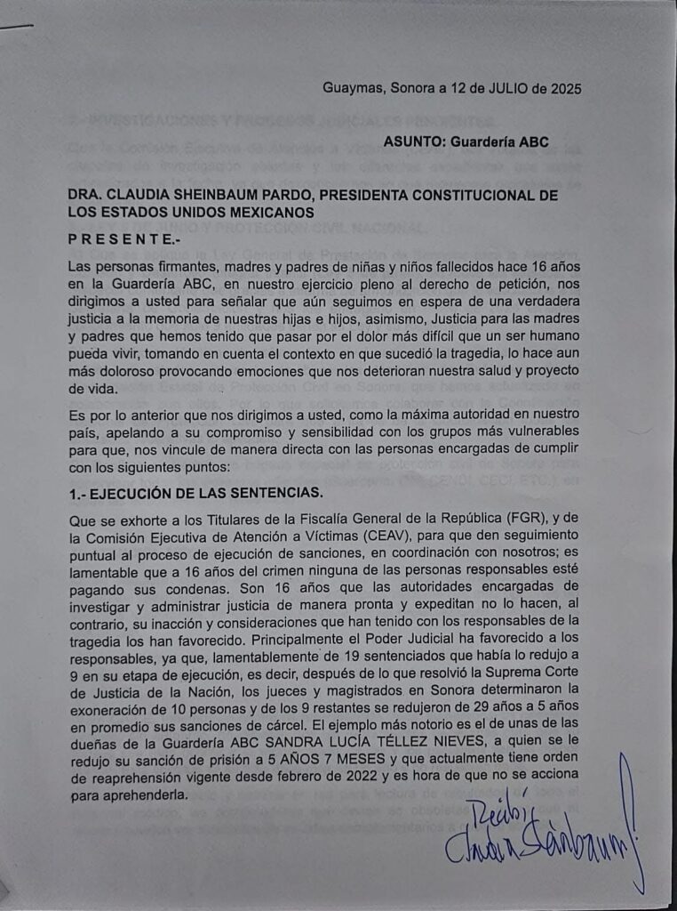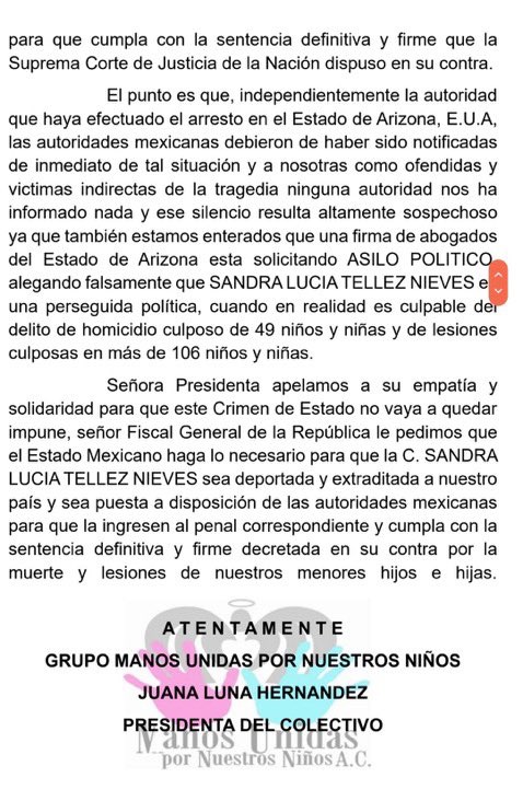 El colectivo Manos Unidas por Nuestros Niños emitió una carta abierta dirigida a la presidenta de México, Claudia Sheinbaum Pardo, y al fiscal general de la República, Alejandro Gertz Manero, para solicitar la inmediata extradición de Sandra Lucía Téllez Nieves, una de las propietarias de la Guardería ABC, quien —según afirman— fue detenida recientemente en el estado de Arizona, Estados Unidos.