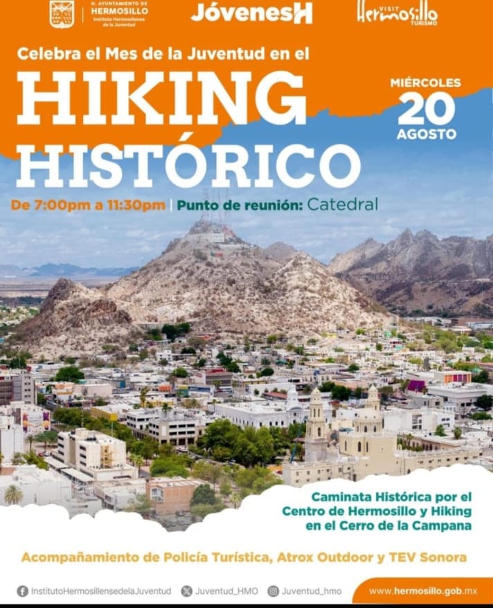El Instituto Hermosillense de la Juventud (IHJ), en colaboración con la Dirección de Desarrollo Turístico, invita a toda la comunidad a participar en el Hiking Histórico, una caminata especial que se realizará el próximo miércoles 20 de agosto para celebrar el Mes de la Juventud.