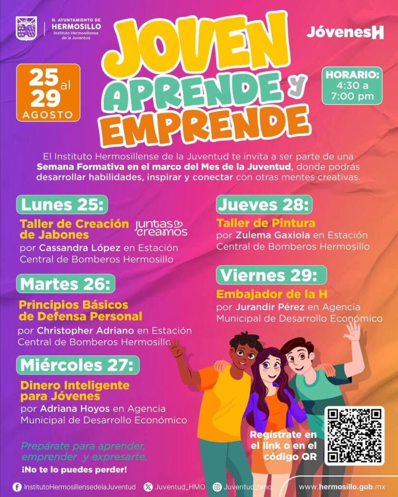 El programa concluye el viernes 29 de agosto próximo en la AMDE, con el tema “Embajador de la H” con Jurandir Pérez como instructor y mismo horario, explicó Francisco Villaescusa, quien reiteró la invitación a las y los jóvenes con interés de desarrollar su liderazgo y habilidades técnicas y sociales con apoyo del Instituto Hermosillense de la Juventud.