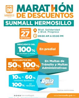Para apoyar la economía de las familias hermosillenses, el Ayuntamiento de Hermosillo, a través de la Tesorería Municipal, el sábado 27 de septiembre llevará el Maratón de Descuentos a Sun Mall, de 9:00 a 15:00 horas.