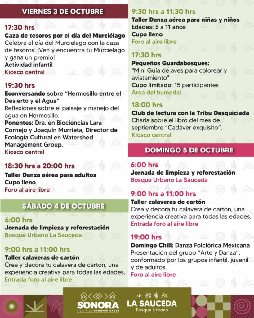 El Gobierno de Sonora, a través del Bosque Urbano La Sauceda, invita a la comunidad a disfrutar de un fin de semana lleno de actividades gratuitas que combinan cultura, aprendizaje y convivencia familiar en un espacio natural dentro de la ciudad.