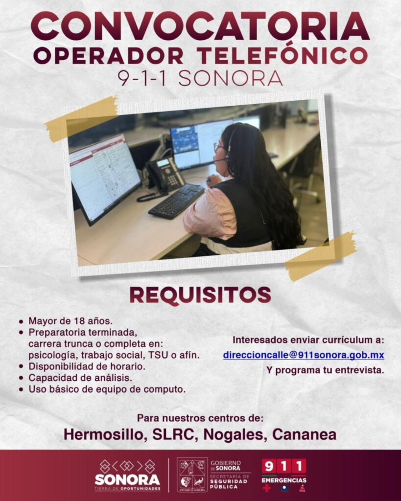Para fortalecer la atención que el Gobierno de Sonora brinda a la ciudadanía que reporta emergencias, la Secretaría de Seguridad Pública (SSP) anunció que ofrece opciones de empleo como Operadores Telefónicos de la Línea 9-1-1 en Hermosillo, San Luis Río Colorado, Nogales y Cananea.