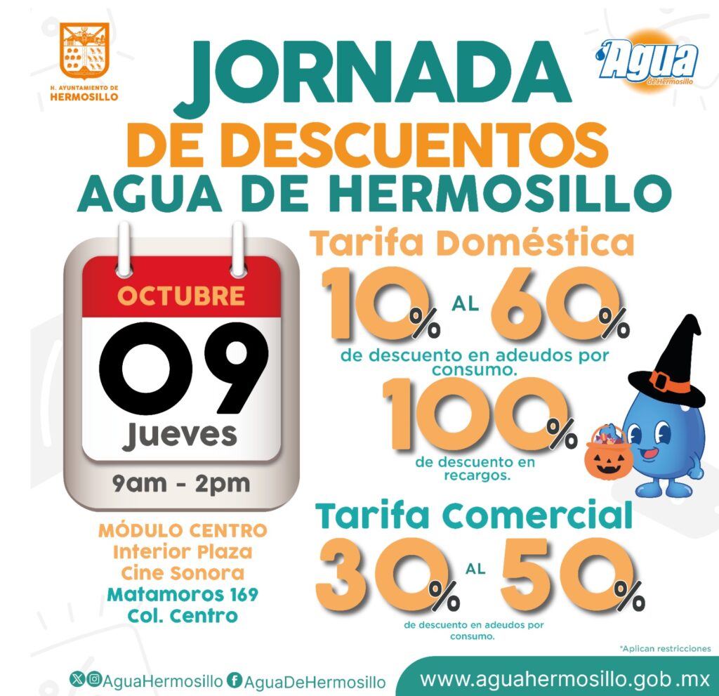 Agua de Hermosillo convoca a sus usuarios a participar en la Jornada de Descuentos que se llevará a cabo el jueves 09 de octubre, en el Módulo Centro Interior Plaza Cine Sonora, en un horario de 9:00 a.m. a 2:00 p.m.