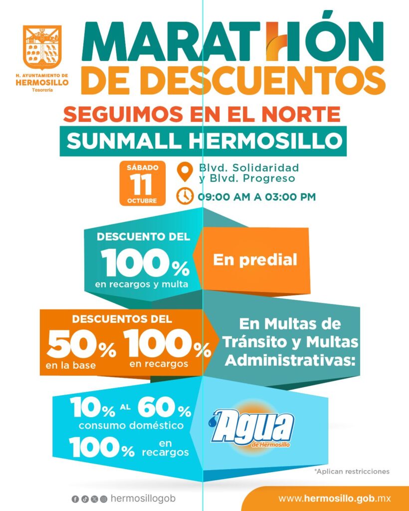 La funcionaria en la administración que encabeza Antonio Astiazarán Gutiérrez invitó a quienes tengan adeudos pendientes por los conceptos regionales aprovechar este nuevo maratón en la plaza Sun Mall, que se localiza en Progreso y Solidaridad, en el norte de Hermosillo.