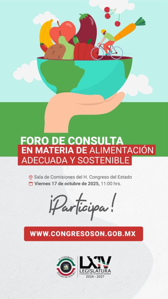 Con el propósito de promover la participación de las y los sonorenses, el Congreso del Estado de Sonora invitó al Foro de Consulta Ciudadana sobre el Proyecto de Ley de Alimentación Adecuada y Sostenible del Estado.