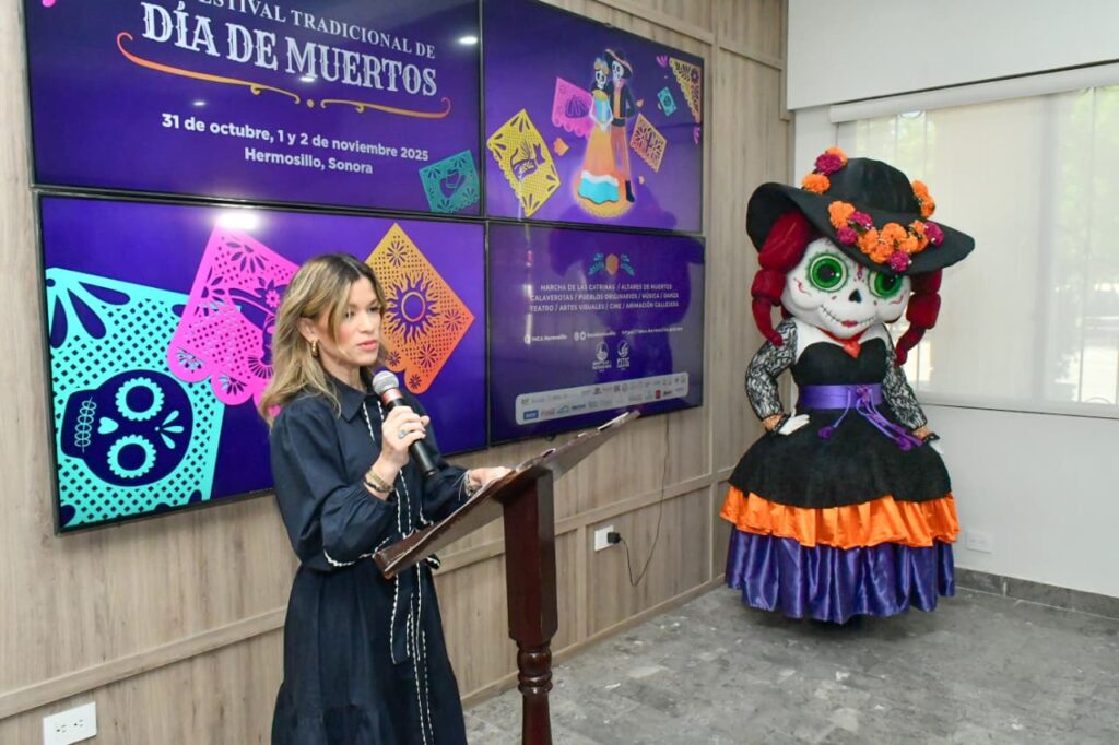 La directora general del Instituto Municipal de Cultura y Arte (IMCA), Marianna González Gastélum, acompañada del personaje Trina, Catrina presentó el programa del VII Festival Tradicional del Día de Muertos, que se celebrará del 31 de octubre al 2 de noviembre y llenará de color arte, música y tradición al Centro Histórico de la ciudad, con una gran variedad de actividades para todas las familias.