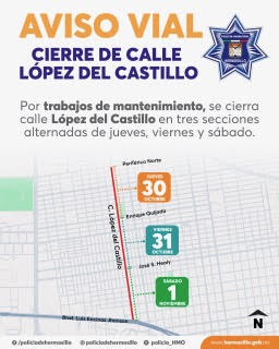 A partir de este miércoles 30 de octubre la Dirección General de Desarrollo de Infraestructura (DGDI) inició el mantenimiento en la calle López del Castillo entre Periférico Norte y Luis Encinas como parte del trabajo de mejoras a las vialidades, informó Astarté Corro Ruiz.