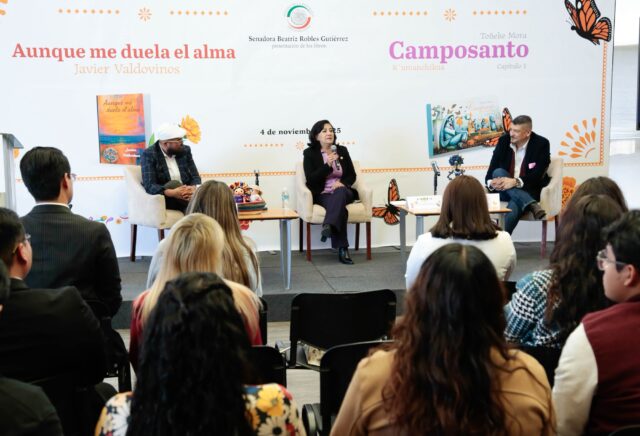 La senadora Beatriz Robles Gutiérrez encabezó la presentación de las obras literarias “Camposanto”, de Toñeke Mora, y “Aunque me duela el alma”, de Javier Valdovinos, para celebrar la palabra escrita, la memoria, el arte y la sensibilidad mexicana, “que sabe mirar de frente a la muerte y reír con ella”.