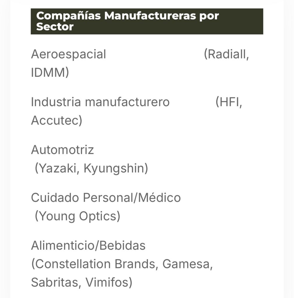 En el apartado titulado “Compañías Manufactureras por Sector”, COPRECO agrupa a diversas industrias bajo categorías como Aeroespacial, Automotriz, Cuidado Personal/Médico y Alimenticio/Bebidas. En el rubro de Industria Manufacturera, se sigue enlistando a HFI y Accutec, aunque esta última trasladó completamente su producción y operaciones al estado de Aguascalientes.