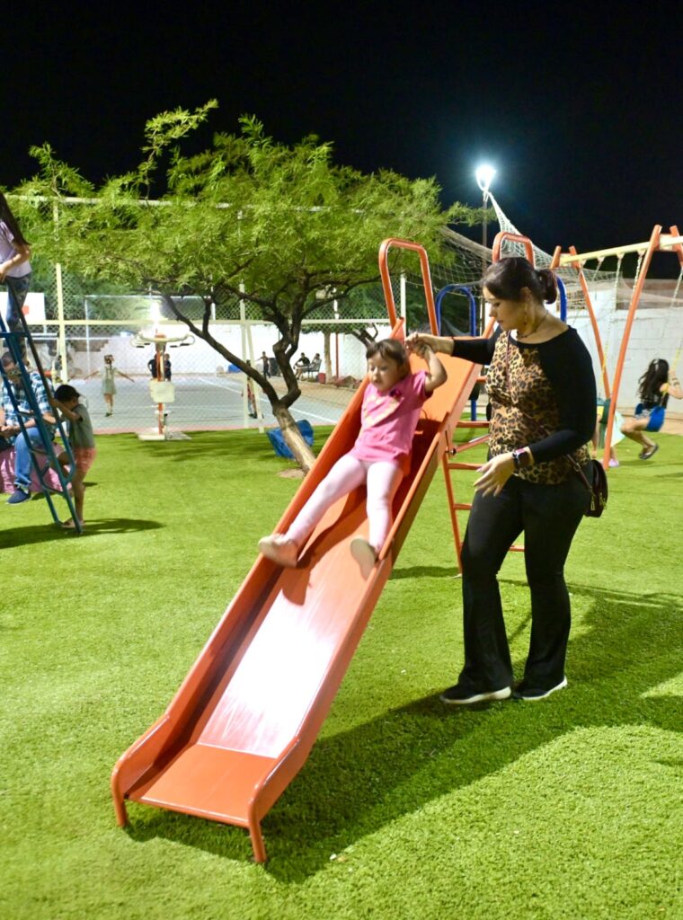 “Yo les agradezco infinitamente su voto de confianza para hacerlo posible, pero además las y los invito a que sigamos juntos trabajando en equipo”, externó Toño Astiazarán al atestiguar que el lugar cuenta con columpios, resbaladillas, pasamanos, ejercitadores, pasto sintético, luminarias y gradas nuevas en la cancha deportiva.