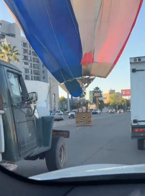 Imágenes difundidas por usuarios de redes sociales muestran un globo de colores azul y morado descendiendo mientras transeúntes de la zona ayudaron al piloto a evitar que la canastilla volcara o se elevara nuevamente.