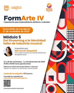 El Ayuntamiento de Hermosillo, a través del Instituto Municipal de Cultura y Arte convoca a artistas, integrantes de colectivos, gestores y promotores culturales a participar en el Módulo “Del streaming a la identidad: taller de industria musical”, del programa FormArte IV, los días 27 y 28 de noviembre y 1 y 2 de diciembre.