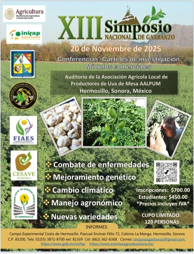 Con el propósito de impulsar la innovación tecnológica en el cultivo de garbanzo, la Secretaría de Agricultura, Ganadería, Recursos Hidráulicos, Pesca y Acuacultura (Sagarhpa), coordina con el Inifap la realización del XIII Simposio Nacional de Garbanzo, a efectuarse este 20 de noviembre a las 9:00 horas en el auditorio de la Asociación de Productores de Uva de Mesa en Hermosillo.