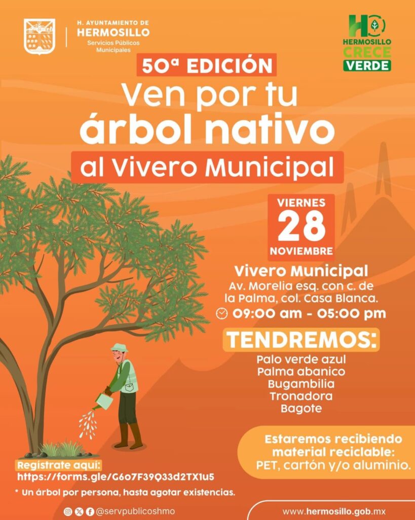 Se recomienda hacer un registro previo a través del enlace https://docs.google.com/forms/d/e/1FAIpQLScDumvXjQbhobDHppdQILCmGJrmRzIuiC5fWpFgNdse1dGZQg/viewform, para agilizar y dar orden a esta jornada que corresponde al programa “Hermosillo CRECE Verde”, del Gobierno Municipal.