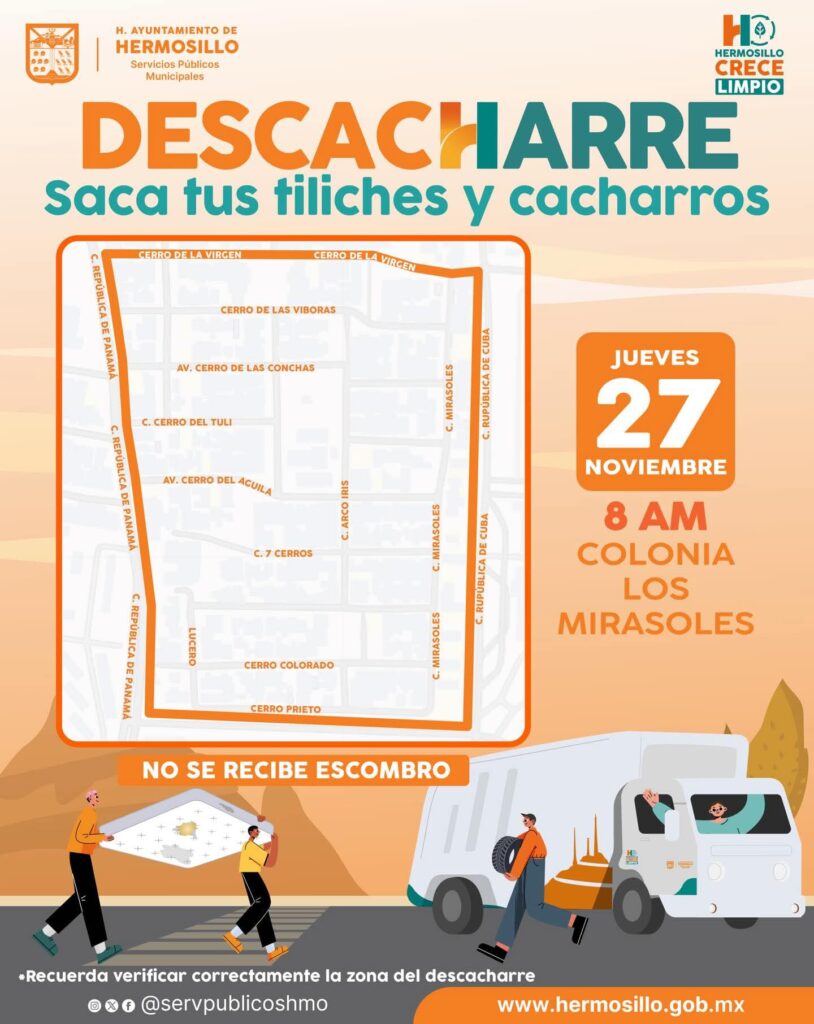 Como parte de las acciones que el Gobierno Municipal realiza para impedir brotes de dengue, zika y Chikunguña, así como la proliferación de fauna nociva en Hermosillo, este jueves 27 de noviembre se realizará una jornada de descacharre en la colonia Los Mirasoles.