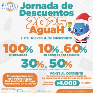 Agua de Hermosillo invita a todas y todos los usuarios a participar en la Jornada de Descuentos 2025, que se llevará a cabo este jueves 4 de diciembre, en la colonia Norberto Ortega, con el propósito de facilitar la regularización de adeudos.