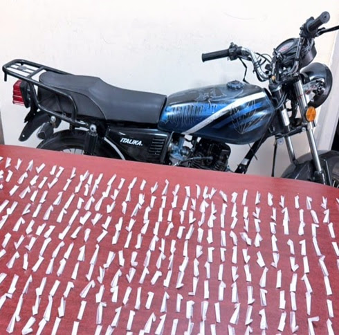 Durante patrullajes de vigilancia en la colonia Francisco Urbalejo, en Cajeme, el domingo siete de diciembre se logró la detención de un motociclista que se identificó como Víctor “N”, de 42 años de edad, al sorprenderlo con 400 envoltorios de plástico que contenían narcótico.