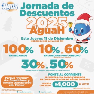 Personal de Agua de Hermosillo estarán atendiendo de 9:00 a 14:00 horas en Avenida Cuauhtémoc y Templo Quetzalcóatl donde usuarios que tengan más de 60 meses de saldo vencido en consumo de agua de tarifa doméstica podrán liquidar con 4 mil pesos para ponerse al corriente.