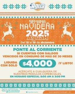 Las y los usuarios de Agua de Hermosillo del área urbana podrán aprovechar la Semana de Descuentos del 15 al 19 de diciembre en horario de 8:00 a 15:00 horas.