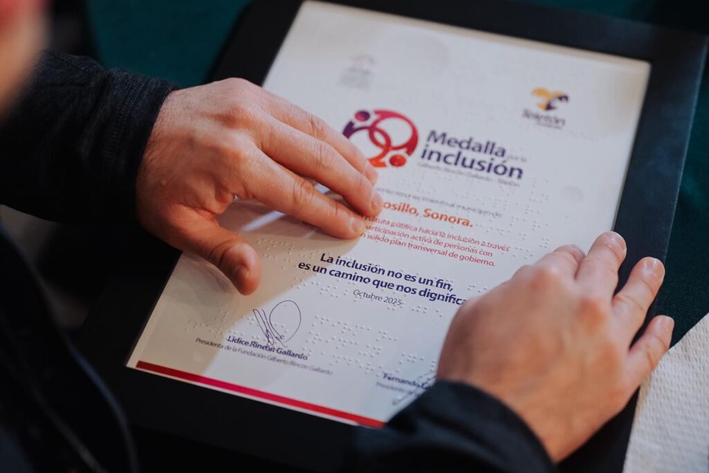 La directora de DIF Hermosillo Madeleine Bonnafoux entregó al Presidente Municipal y la directora de COMUDIS la mención honorífica que obtuvo la estrategia integral H Suma en el marco de la edición 2025 de la medalla Gilberto Rincón Gallardo, organizado por la Fundación Teletón y la Fundación Gilberto Rincón Gallardo.