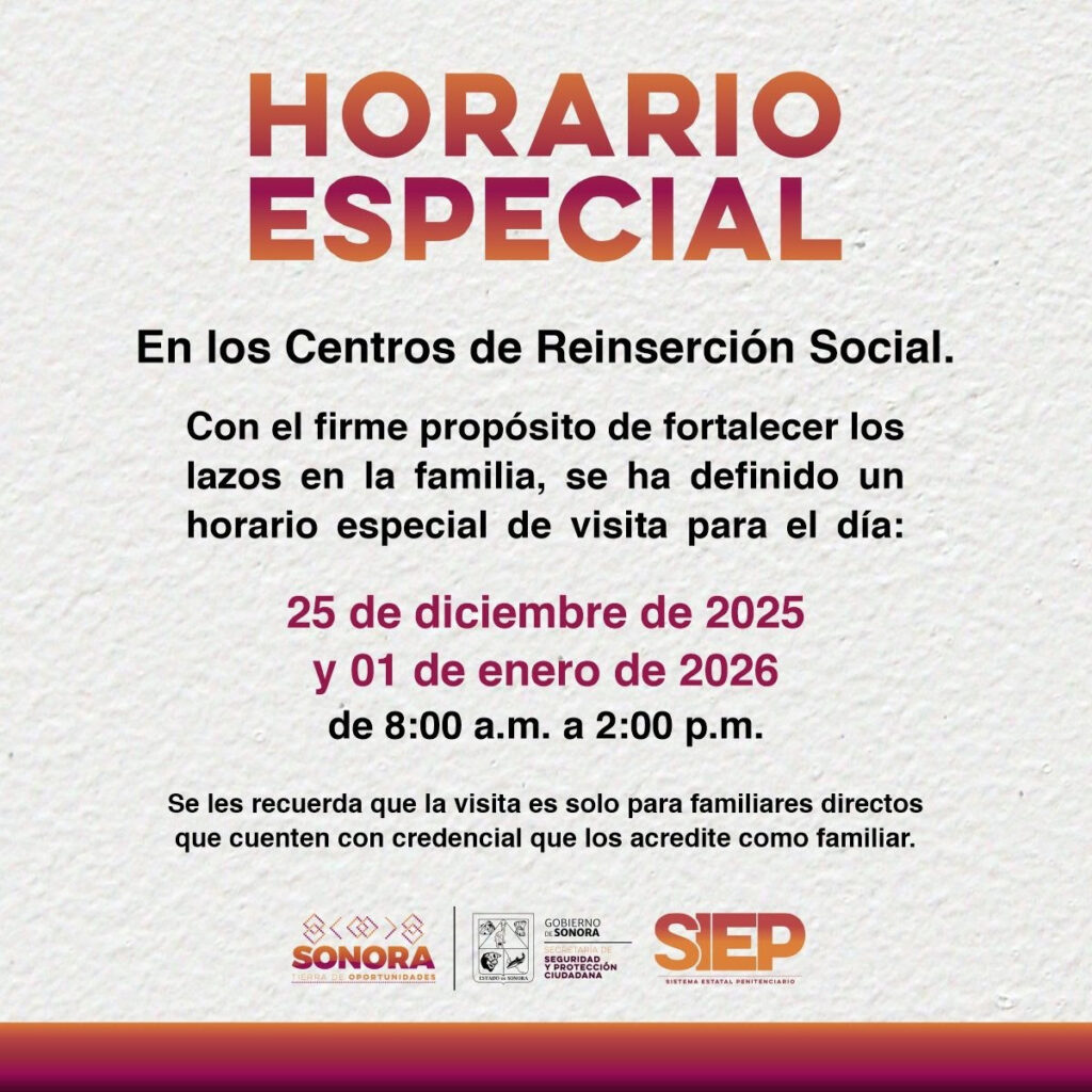 Para el 25 de diciembre y primero de enero del 2026 indicó que, el horario será de 8:00 de la mañana a 2:00 de la tarde, con el fin de que reforzar la comunicación entre padres e hijos, principalmente. Cabe aclarar que esta medida especial será efectiva en los 13 Ceresos de Sonora.